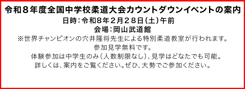 - R.7年度岡山市中学校総合体育大会、陸上競技、卓球、野球、ソフトテニス、サッカー、バレーボール、柔道の結果を公開開始しました。
